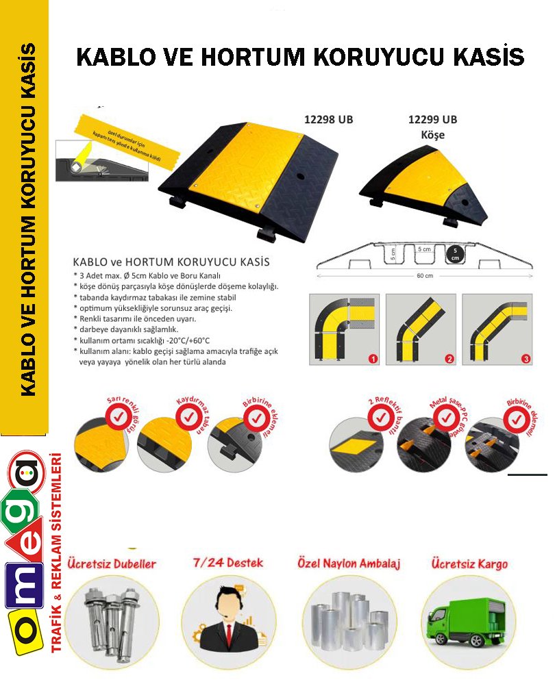 Kablo koruma kasisi; Pratik kullanımı ve kablo kanalları sayesinde, fuar, kongre ve geçici etkinlikler için mükemmel koruyucu görevi görmektedir. Kablo kanalı, üretimde kullanılan teknikler sayesinde yıpratıcı araç trafiğine karşı dayanıklıdır. Zorlu hava şartlarına karşı ( -40° +60° ) dayanıklı üretilmiştir. Yüksek görünürlüğü sayesinde kolayca fark edilebilmektedir. Universal uyarı tonlarına (rengine) sahiptir. Kurulumu ve taşıması kolaydır. Modüler yapıdadır, yan yana eklenerek uzatılabilir. Kablo kanalı kasisler iletken değildir, bu sayede meydana gelebilecek tehlikeler önlenir. Tonajlı geçişlerde hiçbir şekilde zarar görmemektedir. Gövde ağırlığı 8.7 kg'dır.