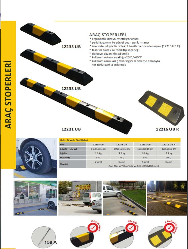 Araç yaslama stoperi veya Araç durdurucu olarak da adlandırılmaktadır. Açık veya kapalı bütün otoparklarda, bina girişlerinde, mağaza önlerinde, kamu kurum ve kuruluşlarında düzenli araç parkını sağlamak için ideal bir üründür.
