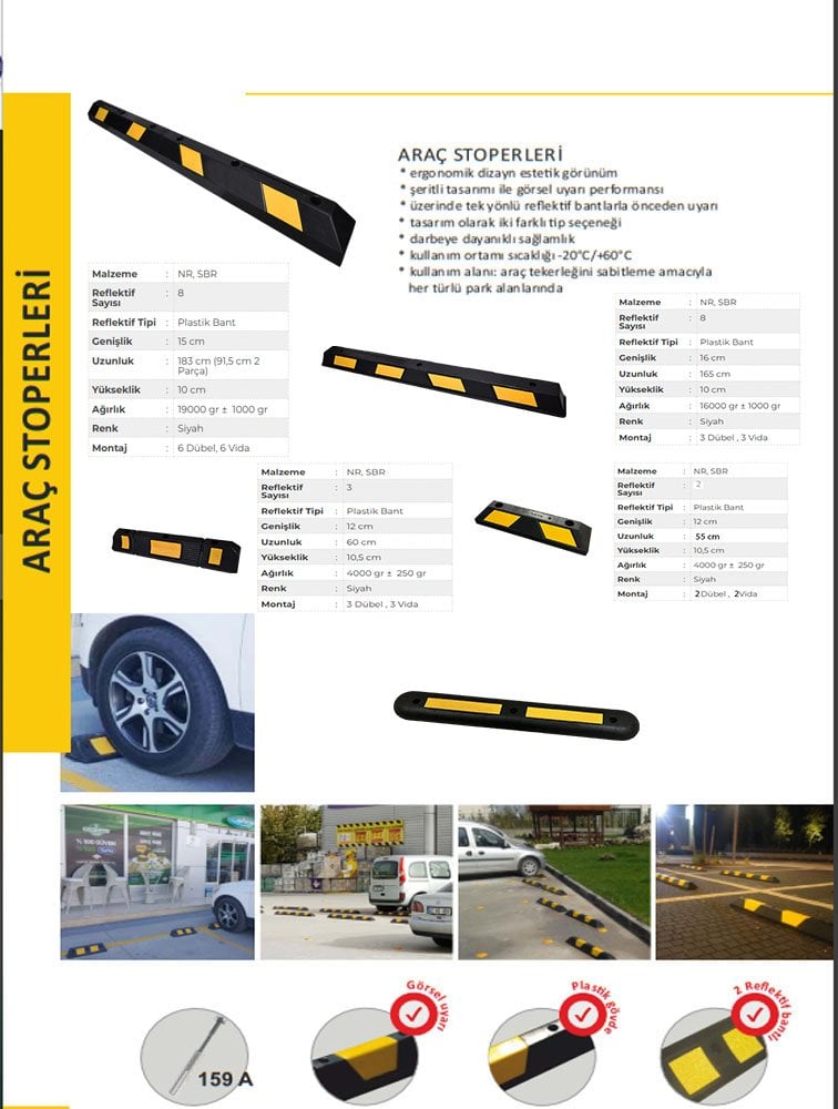 Araç yaslama stoperi veya Araç durdurucu olarak da adlandırılmaktadır. Açık veya kapalı bütün otoparklarda, bina girişlerinde, mağaza önlerinde, kamu kurum ve kuruluşlarında düzenli araç parkını sağlamak için ideal bir üründür.