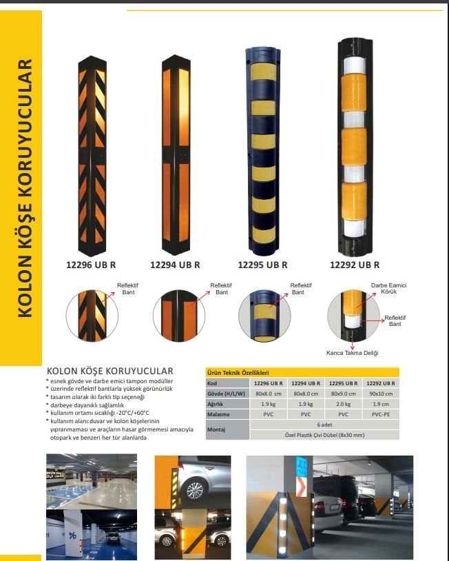 Kauçuk malzemeden üretilen gövde üzerinde, reflektif bant yansıtıcı monte edilmiştir. Reflektif bant ile kapalı otoparklarda mükemmel bir görünürlük sağlanır. Kolon köşe koruyucu, 6 adet plastik çivi ile monte edilir.