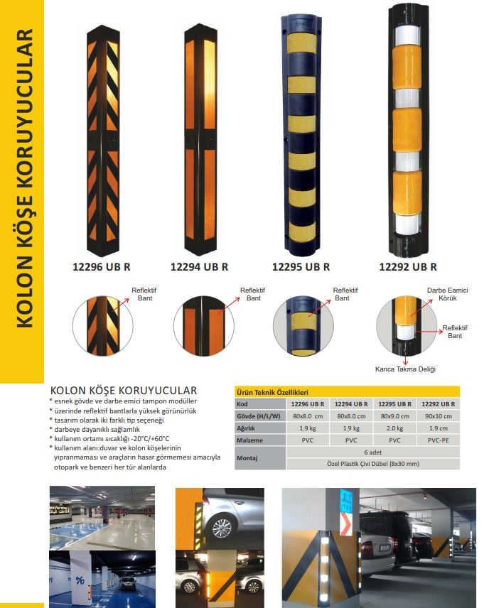 Kauçuk malzemeden üretilen gövde üzerinde, reflektif bant yansıtıcı monte edilmiştir. Reflektif bant ile kapalı otoparklarda mükemmel bir görünürlük sağlanır. Kolon köşe koruyucu, 6 adet plastik çivi ile monte edilir.